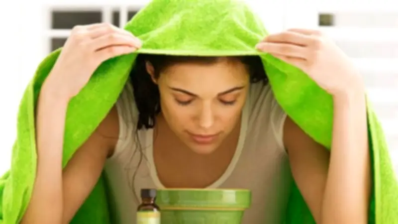 - تعريض الوجه للبخار: يتم تقريب الوجه من الوعاء مع تغطية الرأس بمنشفة كبيرة لحبس البخار، مع ترك مسافة مناسبة حتى لا يتسبب البخار في حروق للجلد.