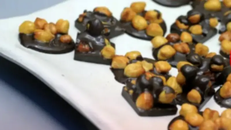 بعد تحميص الحمص، توضع الشوكولاتة الداكنة المذابة في قالب على شكل مربعات أو أي شكل مرغوب. ثم يضاف الحمص المحمص فوق الشوكولاتة ويترك ليبرد ويتصلب، مما يسمح للمكونات بالالتصاق معاً وتشكيل كرات لذيذة. أخيراً، تقدم كرات حمص بالشوكولاتة كوجبة خفيفة صحية أو كتحلية منخفضة السعرات الحرارية.