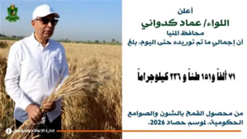 أعلن اللواء عماد كدواني محافظ المنيا، أن إجمالي كميات توريد القمح في المنيا منذ انطلاق موسم 2026 بلغ 71 ألفًا و151 طنًا و236 كيلوجرامًا، في خطوة تعكس نجاح جهود الدولة في دعم منظومة الأمن الغذائي وزيادة المخزون الاستراتيجي من الحبوب الأساسية، خاصة مع استمرار موسم الحصاد في مختلف مراكز المنيا.