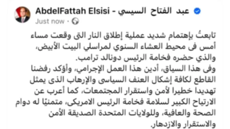 أعرب الرئيس عبد الفتاح السيسي عن ارتياحه الكبير لسلامة الرئيس الأمريكي دونالد ترامب، وذلك بعد عملية إطلاق النار التي وقعت مساء أمس السبت في محيط العشاء السنوي لمراسلي البيت الأبيض. وجاءت تصريحات السيسي في تدوينة نشرها عبر حسابه الرسمي على موقع التواصل الاجتماعي فيسبوك، حيث أكد متابعته الدقيقة للحادث الذي شهده العاصمة واشنطن.