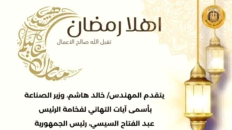 تقدّم المهندس خالد هاشم، وزير الصناعة في جمهورية مصر العربية، بأسمى آيات التهاني والتبريكات إلى الرئيس عبد الفتاح السيسي، رئيس الجمهورية، وإلى الشعب المصري العظيم، وكذلك إلى الأمتين العربية والإسلامية جمعاء، بمناسبة حلول شهر رمضان المبارك لهذا العام.